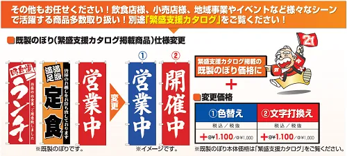 また下地の色を変えたり(①色替え)、書かれている文字を打換えたり(②文字打換え)して、よりお客様のニーズに合ったのぼりを作成することも可能です。